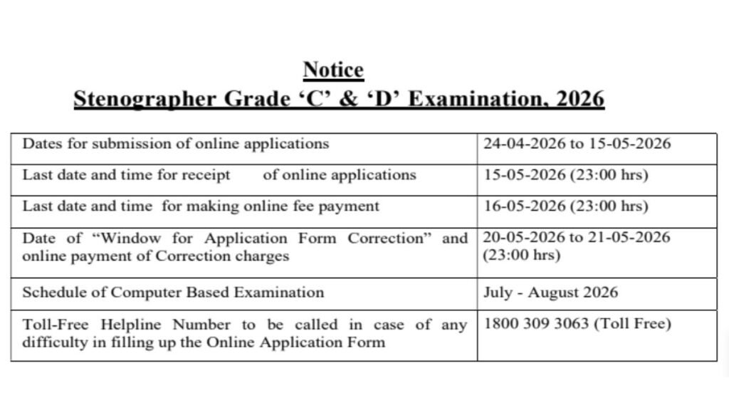 12వ తరగతి ఉత్తీర్ణత తర్వాత సురక్షితమైన ప్రభుత్వ ఉద్యోగం కోరుకునే అభ్యర్థులకు SSC Stenographer Grade C & D Recruitment 2026 ఒక సువర్ణావకాశం. గడువు సమీపిస్తున్నందున, అర్హులైన అభ్యర్థులు ఆన్లైన్ ఫారమ్ను వీలైనంత త్వరగా పూర్తి చేయాలి.